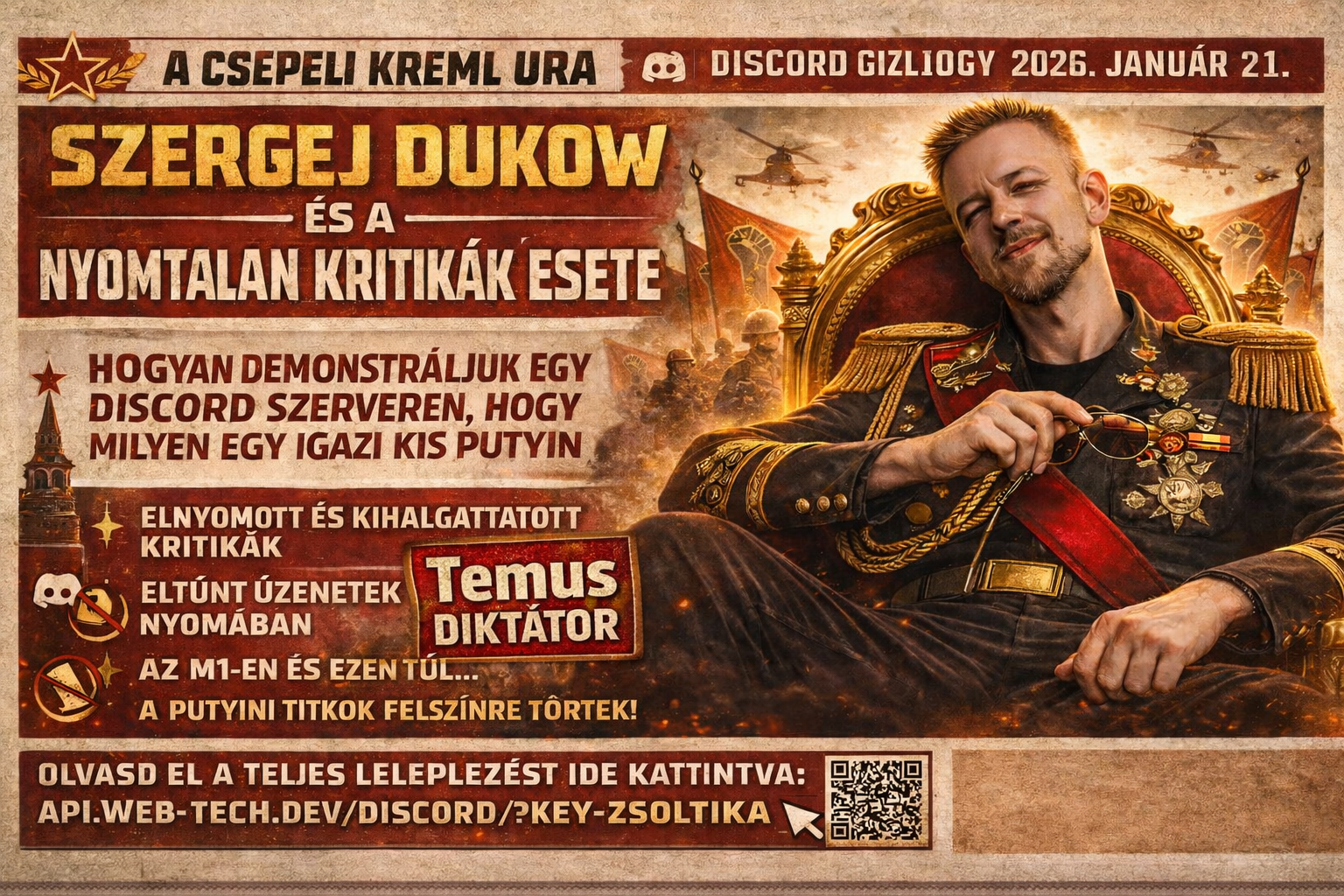 Csepel, 2026. január 21. — Történelmi pillanatnak lehettünk tanúi ma este egy Discord szerveren, ahol egy Szergej Dukow névre hallgató úriember bebizonyította: nem kell Kreml, nem kell FSB, nem kell propaganda-minisztérium — elég egy Discord admin jog és egy sértett ego.